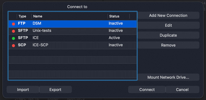 First, download and run DCommander. To connect to a remote server, click the Connection Manager button in the toolbar (or press ⌘K).